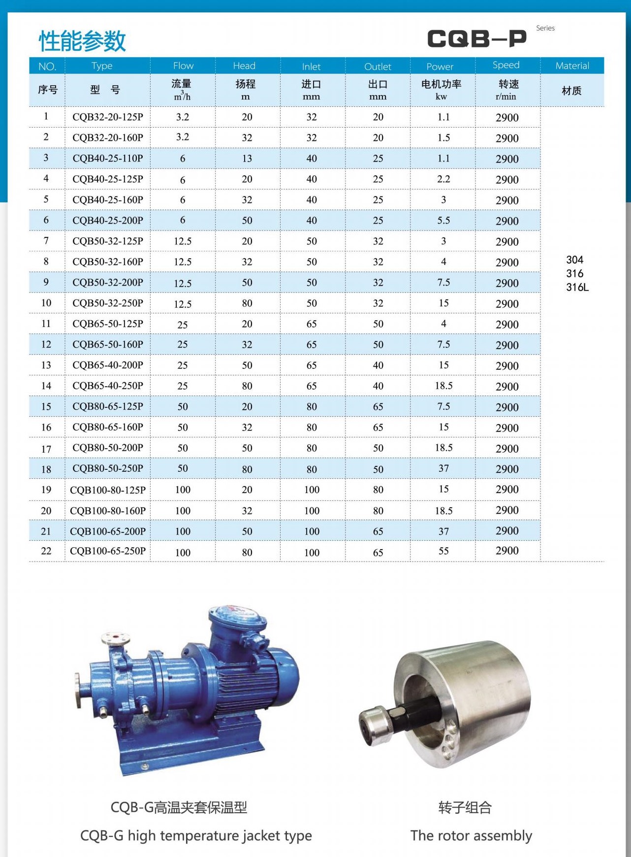 4、CQB-P型不銹鋼高溫磁力泵流量范圍:3.6-100T/ h。 揚程范圍:15-80m 。 適用介質:堿液、有機溶劑、醫(yī)藥中間體等。 特點:超長壽命,免維護。 可以針對不同工況條件,訂制特殊的配置。