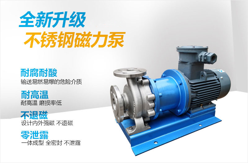 3、CQB-P型不銹鋼高溫磁力泵與氟塑料磁力泵基本相同。但其過流部件為奧氏體不銹鋼(304、316L)、雙相不銹鋼、哈氏合金或鈦材等材料制造。相比氟塑料磁力泵,不銹鋼磁力泵制造工藝簡單,適宜輸送濃度較低的酸堿、有機溶劑。